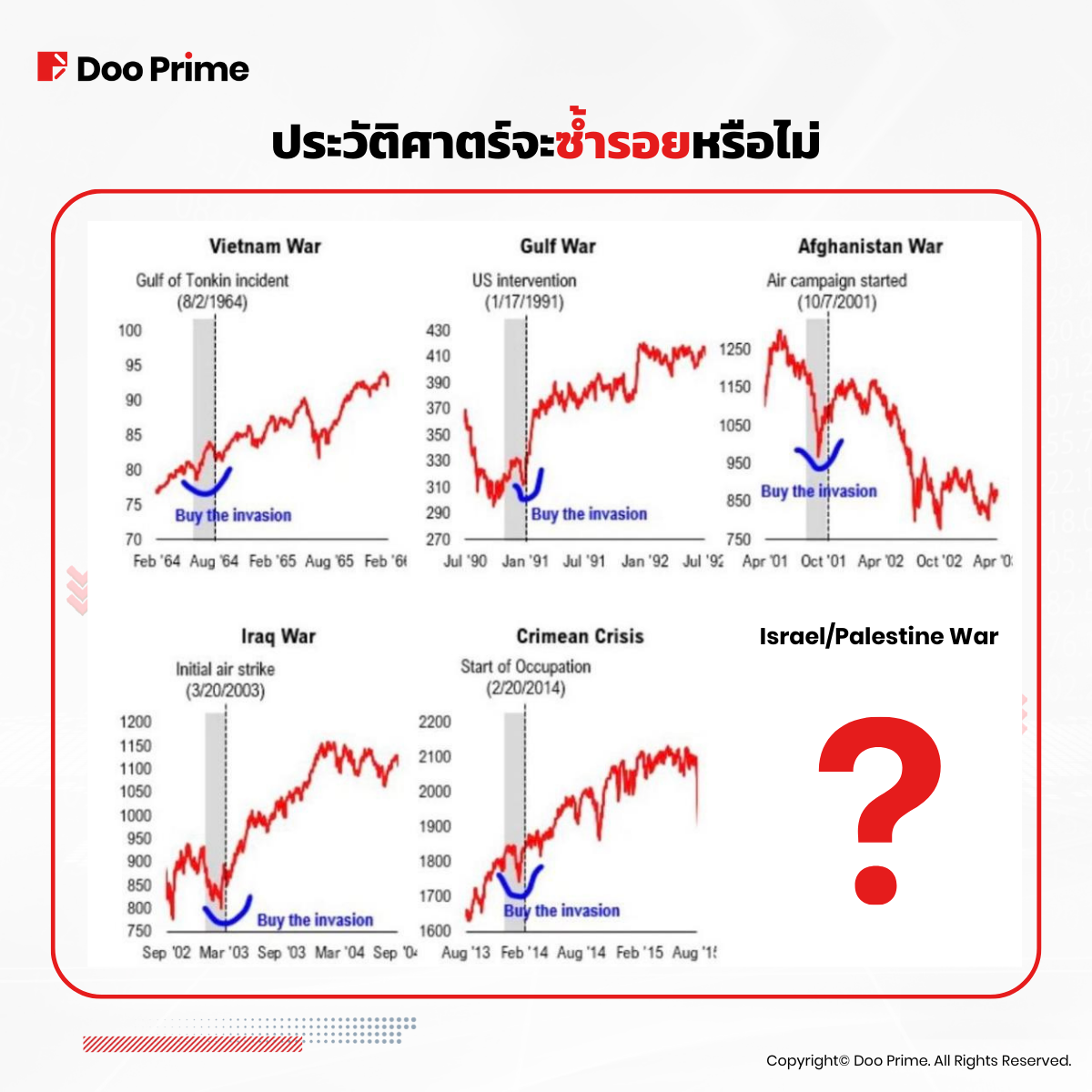 ตรงกันข้ามกับสิ่งที่คนทั่วไปเชื่อที่บ่งบอกว่าสงครามสามารถส่งผลกระทบเชิงบวกต่อตลาดได้จริง โดยปกติแล้ว เมื่อเกิดสงคราม ตลาดมีแนวโน้มที่จะปรับตัวขึ้นหลังจากนั้นไม่นาน สามารถดูแนวโน้มของเหตุการณ์นี้ได้จากแผนภูมิด้านล่าง