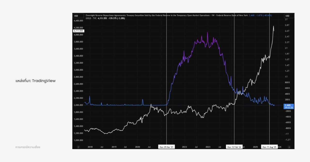 เมื่อปริมาณเงินในโครงการ Reverse Repo ของธนาคารกลางสหรัฐ ซึ่งเป็นกลไกให้ธนาคารและกองทุนพักเงินสดค้างคืน เริ่มลดลงจนเกือบแตะศูนย์ ราคาทองคำก็เริ่มพุ่งขึ้นทันที