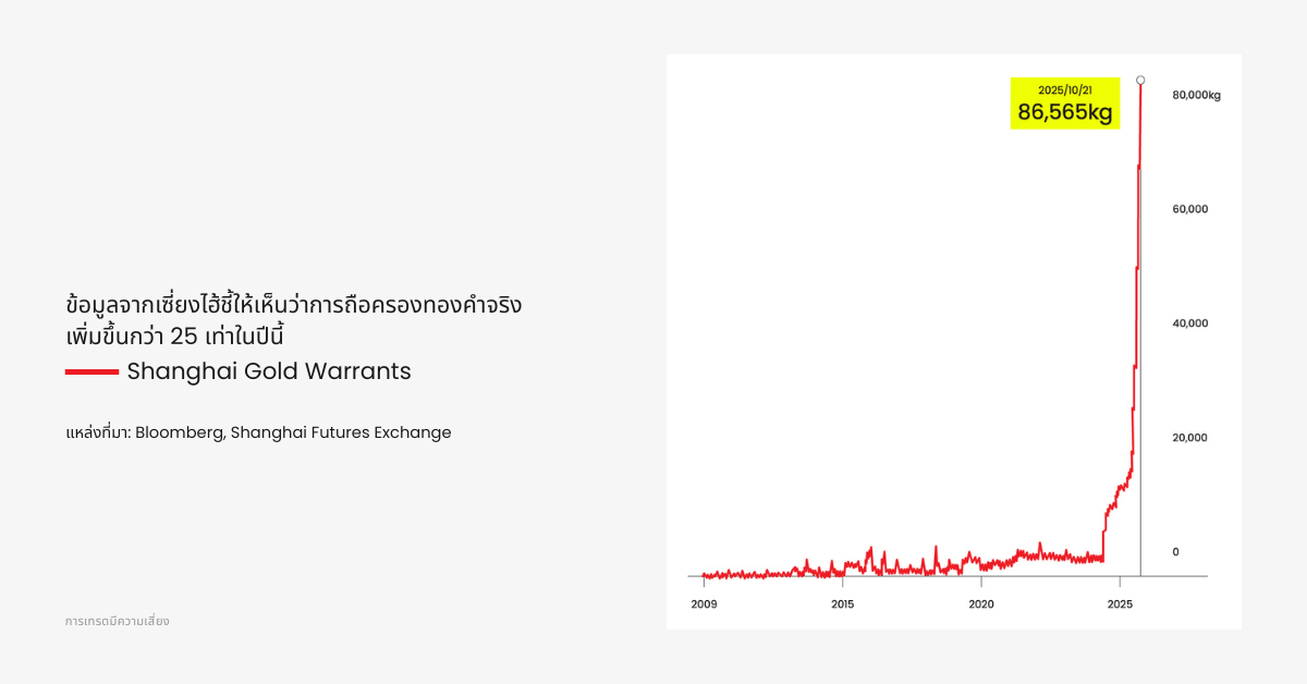 ข้อมูลจากตลาดทองเซี่ยงไฮ้ระบุว่า ใบรับประกันทองคำ พุ่งแตะระดับสูงสุดเป็นประวัติการณ์ที่ 86,565 กิโลกรัมในเดือนตุลาคม 2025