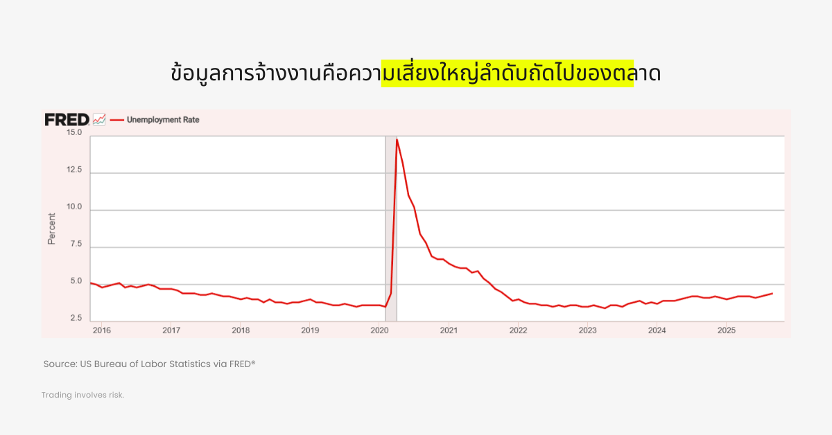 หากข้อมูลการจ้างงานนอกภาคเกษตร (NFP) อ่อนแอลงอย่างรวดเร็ว และอัตราการว่างงานปรับสูงขึ้น การลดดอกเบี้ยอาจถูกมองว่าเป็นการตอบสนองต่อภาวะเศรษฐกิจตึงเครียด มากกว่าการสนับสนุนการเติบโต ในอดีต ช่วงที่ธนาคารกลางสหรัฐฯ ผ่อนคลายนโยบายอย่างเร่งด่วน มักมาพร้อมกับความผันผวนของตลาดที่เพิ่มขึ้น