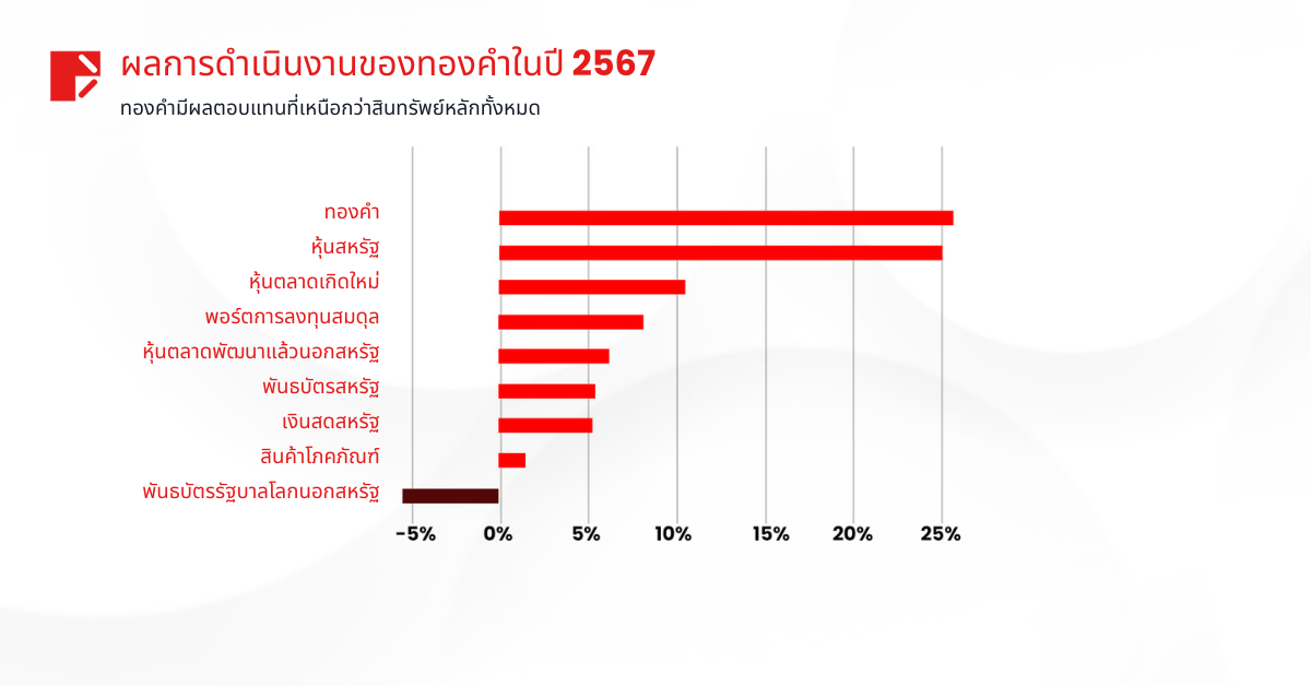 จากผลการดำเนินงานที่โดดเด่นของทองคำในปี 2567 ที่มีความเหนือกว่าทรัพย์สินหลักทั้งหมดและพิสูจน์ว่าเป็นตัวกระจายความเสี่ยงในพอร์ตการลงทุนที่มีประสิทธิภาพ ในปี 2567 มูลค่าทองคำได้เพิ่มขึ้นอย่างต่อเนื่องที่ 25.5% เนื่องจากเป็นตัวเลือกที่มีประสิทธิภาพต่อความตึงเครียดทางการเมืองระหว่างประเทศที่เพิ่มสูงขึ้นและความผันผวนในตลาด