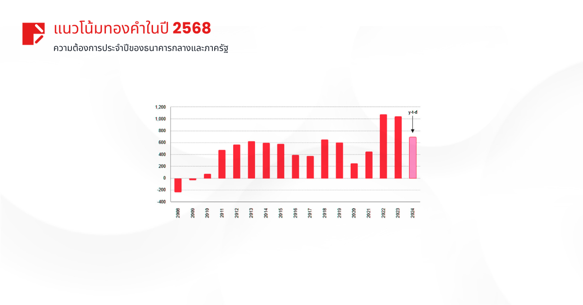 เมื่อมองไปยังปี 2568 ความคิดเห็นในตลาดเกี่ยวกับตัวแปรหลักของเศรษฐกิจมหภาค เช่น จีดีพี อัตราผลตอบแทน และอัตราเงินเฟ้อ บ่งชี้ถึงการเติบโตที่เป็นบวกแต่ค่อนข้างต่ำ โอกาสในการเติบโตที่เป็นไปได้อาจเกิดจากการซื้อทองคำของธนาคารกลางที่มากกว่าที่คาดการณ์ไว้ หรือการถดถอยอย่างรวดเร็วของสภาพการเงิน ซึ่งจะกระตุ้นให้เกิดการเปลี่ยนไปใช้สินทรัพย์ที่ปลอดภัย ในทางกลับกัน การเปลี่ยนแปลงนโยบายการเงินที่ทำให้อัตราดอกเบี้ยสูงขึ้นอาจสร้างความเปลี่ยนแปลงสำคัญ