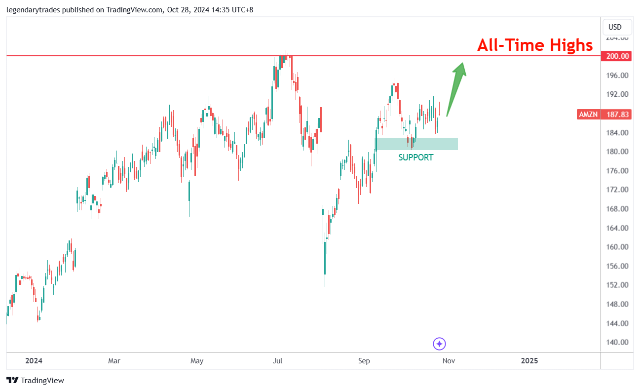 จากมุมมองทางเทคนิค ราคาของ AMZN ขณะนี้อยู่เหนือระดับแนวรับที่ 180 ดอลลาร์ ด้วยผลประกอบการที่แข็งแกร่งและการใช้จ่ายในวันฮาโลวีนที่เพิ่มขึ้น หุ้นอาจทดสอบระดับ 200 ดอลลาร์อีกครั้งและอาจทำลายระดับสูงสุดตลอดกาลใหม่ได้