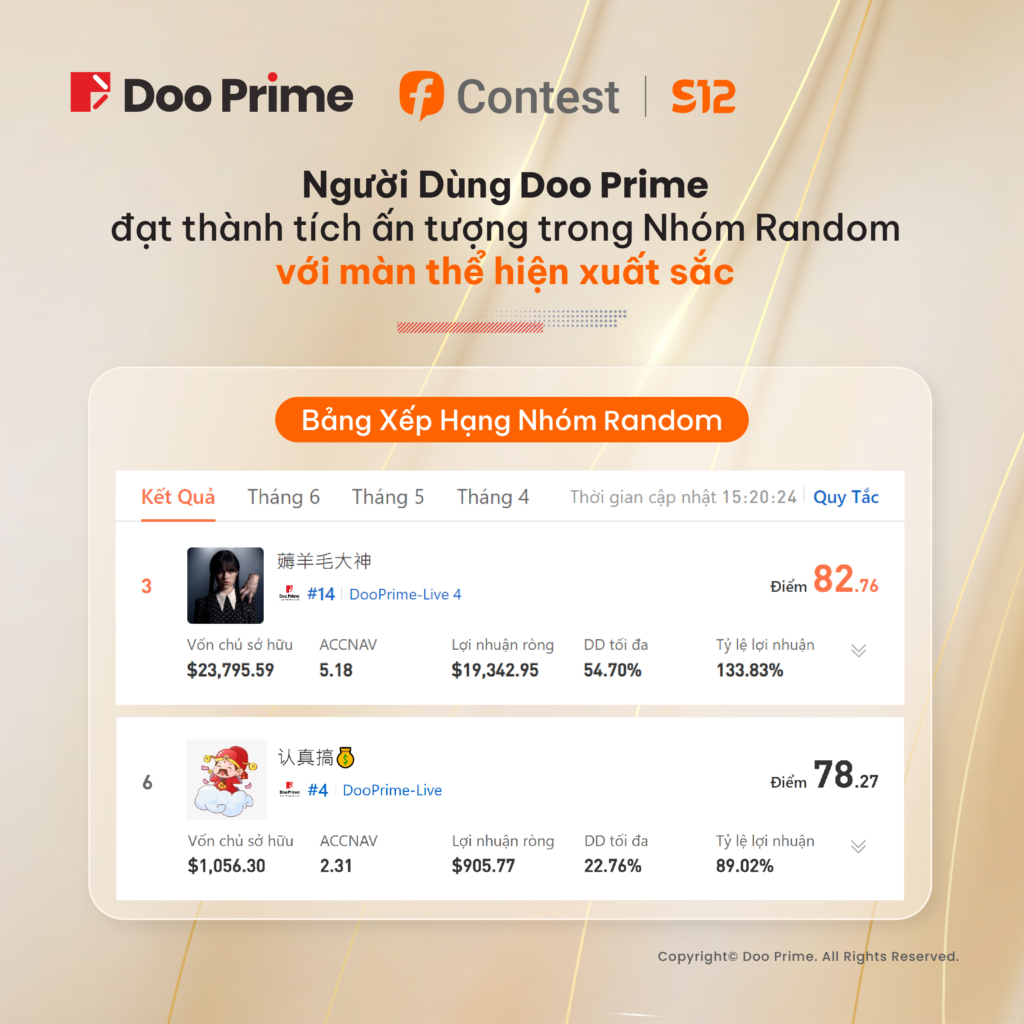 Ngoài ra, 10 nhà giao dịch tại Doo Prime đã bảo toàn vị trí trong top 50 ở tất cả các hạng mục. Theo đó, nhà giao dịch @薅羊毛大神 đã xuất sắc giành vị trí thứ 3 trong Nhóm Random, tích lũy được mức lợi nhuận ròng hơn 9,342.95 USD nhờ vào các các chiến lược giao dịch đặc sắc. Trong khi đó, với tư duy phân tích cùng kỹ năng chuyên môn ấn tượng, nhà giao dịch @认真搞 đứng “chễm chệ” ở vị trí thứ 6 với mức lợi nhuận 89.02% trong bảng xếp hạng chung cuộc.