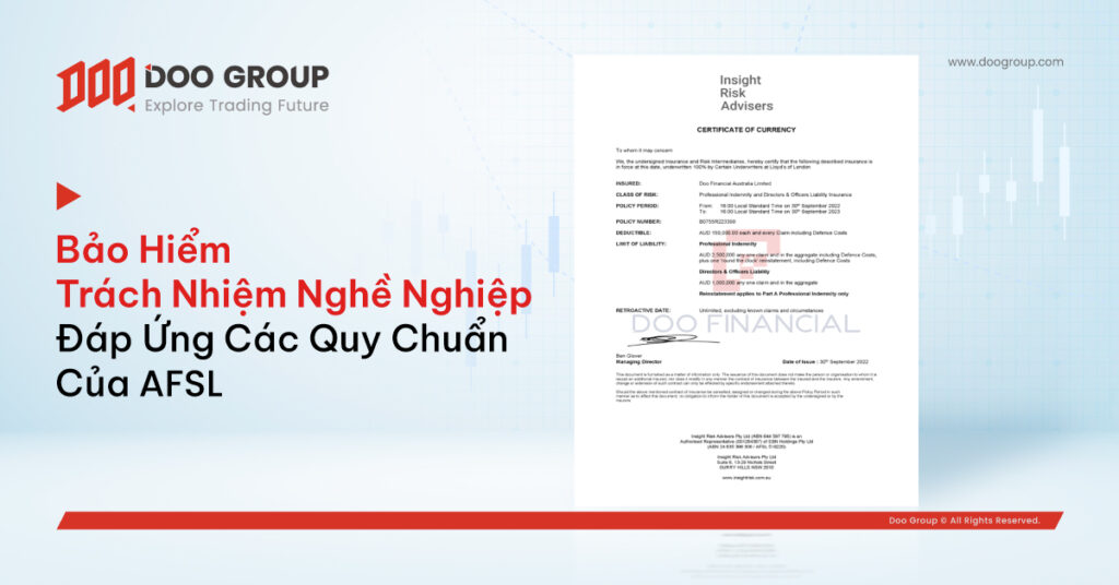 Vào tháng 9, Doo Financial Australia Limited đã tiến hành mua thành công Bảo hiểm Bồi thường Chuyên nghiệp (PII) từ Lloyd’s of London. Thể theo đó, Doo Financial sẽ thực hiện các nghĩa vụ với tư cách là người được cấp Giấy phép Dịch vụ Tài chính Úc (AFSL). Đây là một trong số nhiều nỗ lực của Doo Group trên hành trình cung cấp cho quý khách hàng các dịch vụ tài chính đáng tin cậy.