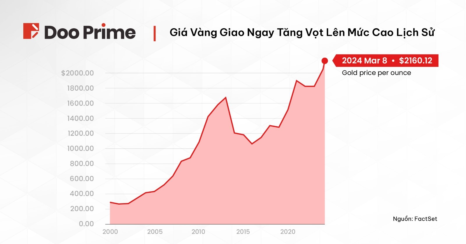 Vàng giao ngay đã trải qua một đợt tăng giá đáng chú ý, chạm mốc 2,156.55 USD và thậm chí chạm đỉnh lịch sử ở mức 2,161.09 USD trong một phiên giao dịch đơn lẻ.